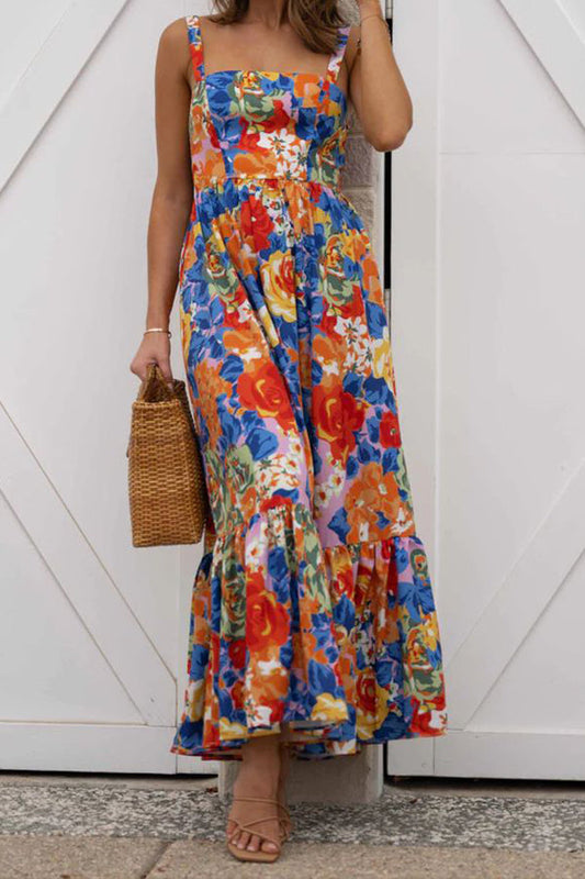 Irregular slanted shoulders blooming print slim dress