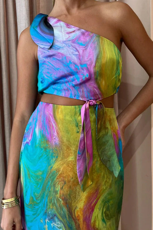 Venus Marble Print Knot Detail Cutout Waist Asymmetric Midi Dress