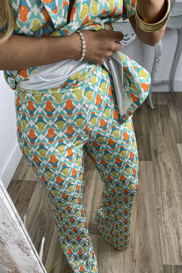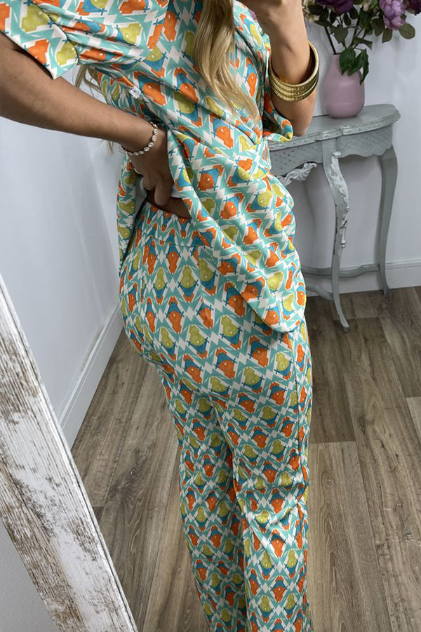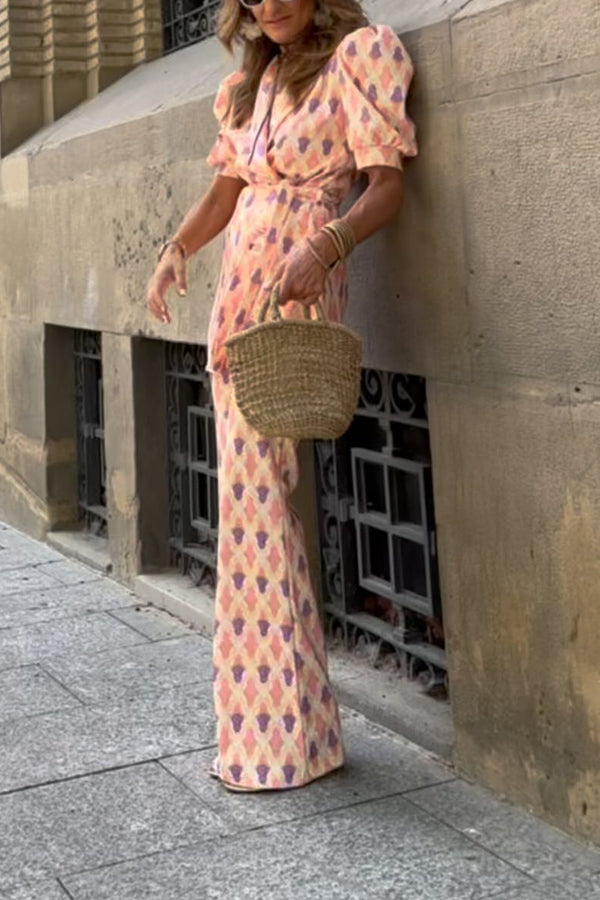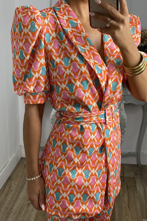 ADARA Fashion Puff Sleeve V-Neck Suit Micro Booth Pants Set
