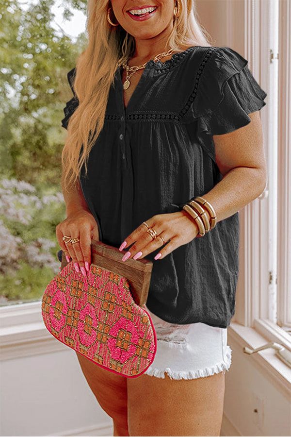Plain Ruffle Sleeve Buttoned Plus Size Boho Top
